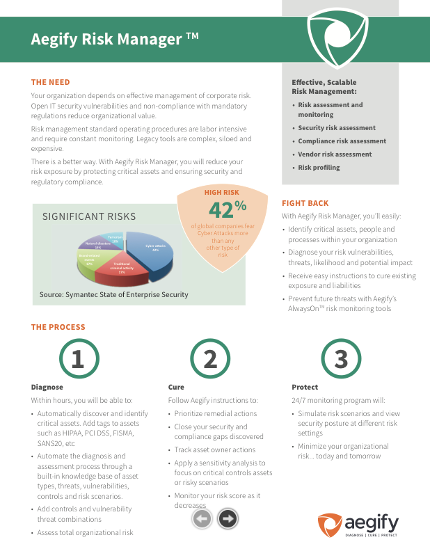 There is a better way. With Aegify Risk Manager, you will reduce your risk exposure by protecting critical assets and ensuring security and regulatory compliance.